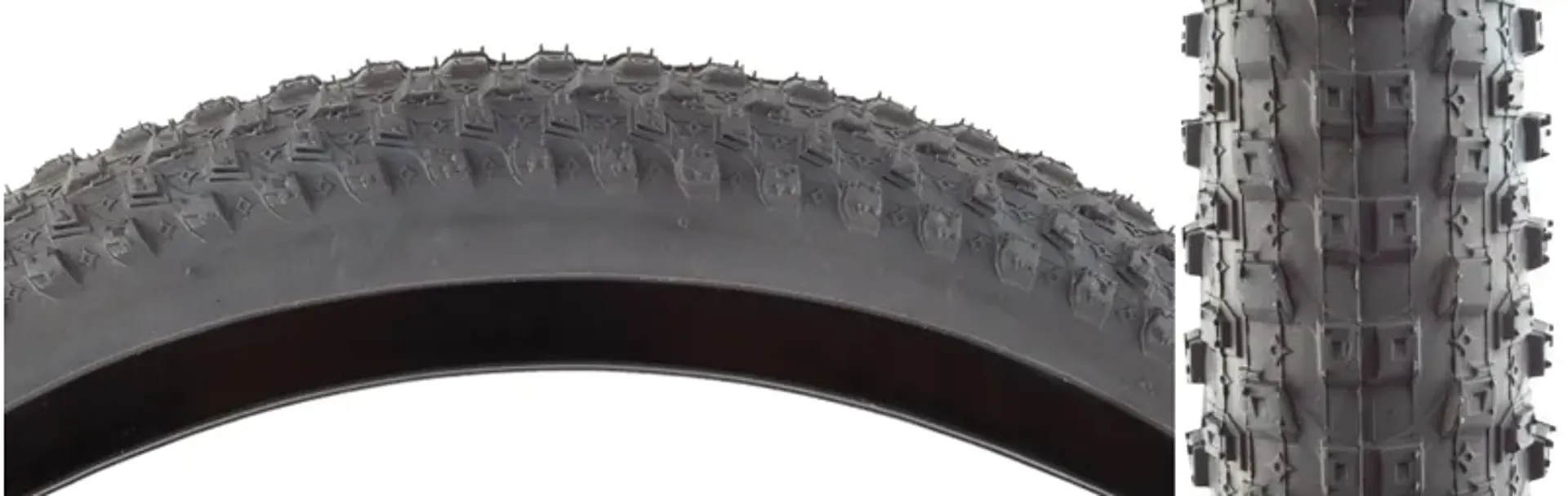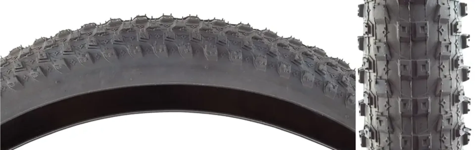 Offroad fat bike tire with densely packed knobs that extend onto the shoulder of the tire.