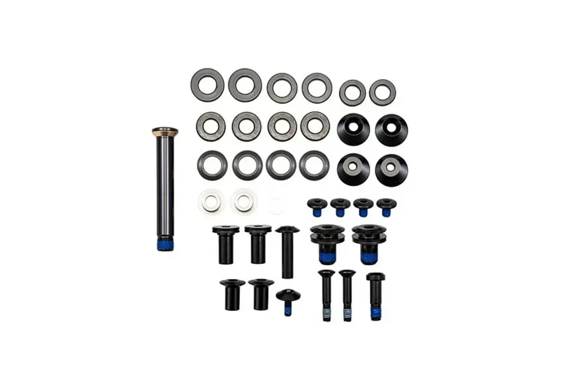 The kit includes all necessary suspension pivot bolts and corresponding spacers required for installation on these carbon bikes.